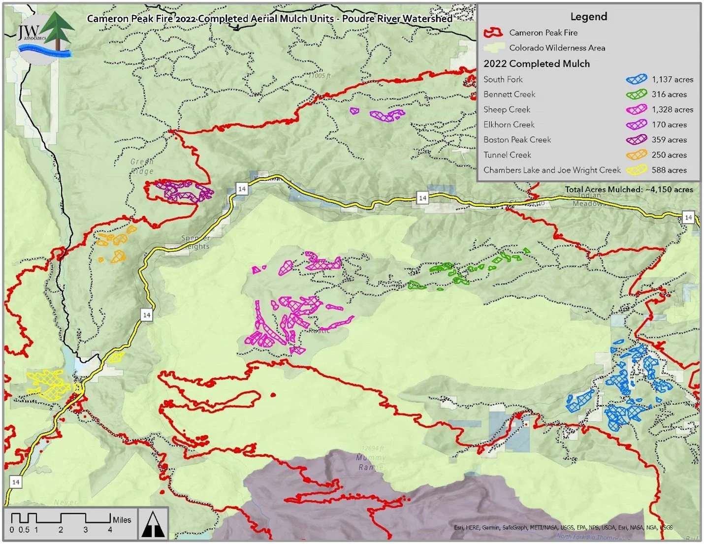 Cameron Peak Fire Recovery Partners completed aerial mulching in the Poudre Watershed on Friday, August 26th. The team completed 4,150 acres this summer, bringing the total area mulched to ~9,150 acres. Mulching operations have now moved to the Big Thompson Watershed. Thank you to all our partners and funders for supporting a successful 2022 season of aerial mulch treatments.