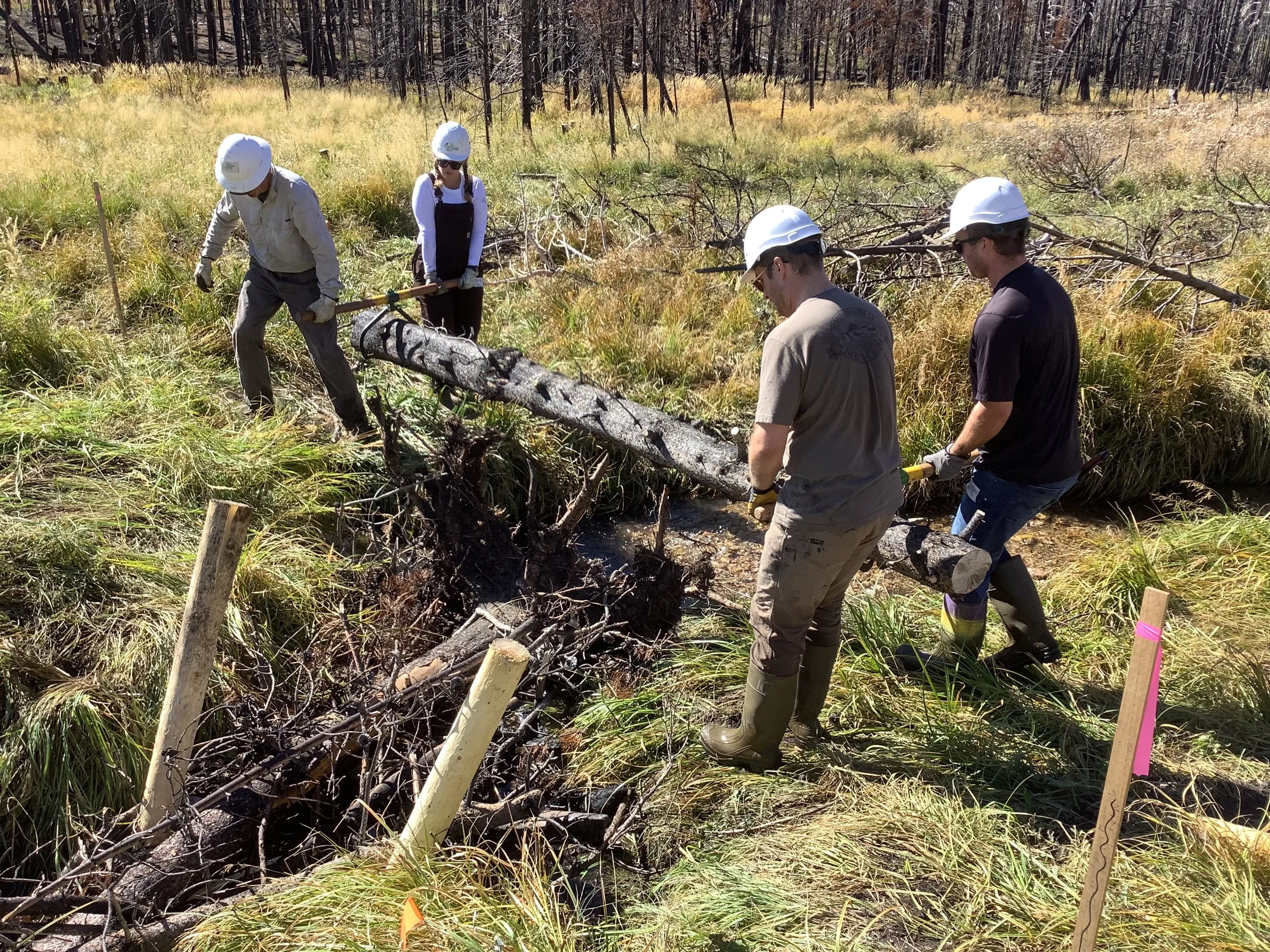 Volunteers from Wildlands Restoration Volunteers (WRV) install post-assisted log structures (PALS), a low-tech restoration structure that mimic and promote accumulation of large woody debris (LWD) and are designed to influence hydraulic, hydrologic and geomorphic processes. PALS are designed to influence hydraulics across a range of flows, and depending on the design, may force the creation of an upstream pond (University of Utah, 2019)