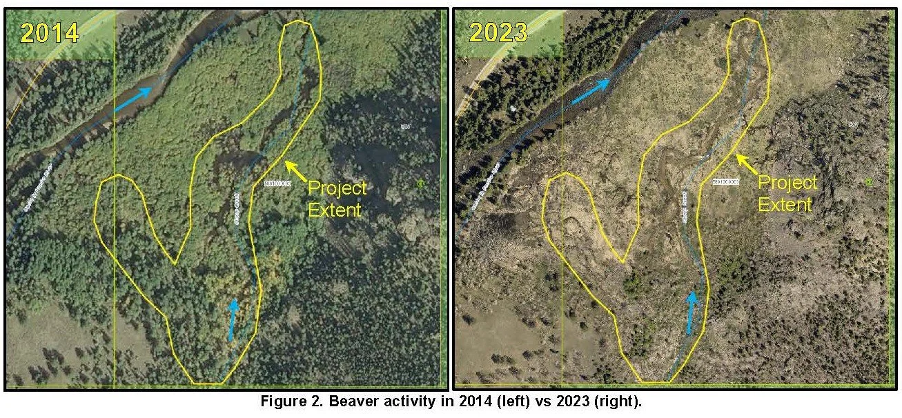 The site has experienced significant changes over the last several decades. Property owners report having seen pervasive beaver throughout the Sheep Creek alluvial fan prior to the Cameron Peak Fire. There has been very minimal beaver activity following the fire despite this alluvial fan being dominated by beaver activity in the past. Historic evidence of beaver activity can be seen in aerial imagery (Figure 2 below) as well as in the field.